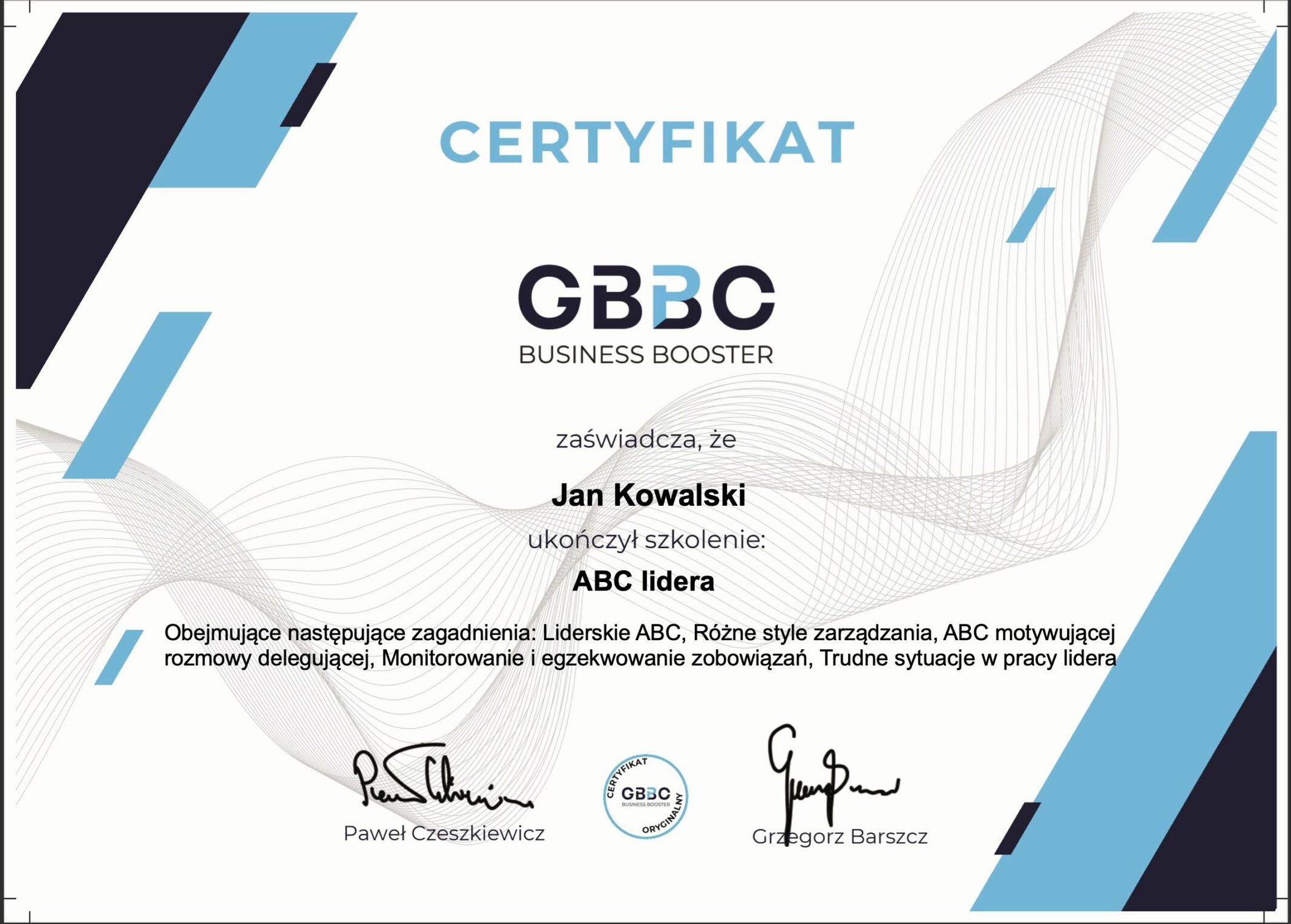 Każdy uczestnik szkolenia ABC lidera otrzymuje imienny certyfikat, który jest oficjalnym potwierdzeniem zdobytej wiedzy i umiejętności. Dokument ten nie jest jedynie pamiątką - stanowi praktyczne narzędzie budowania wiarygodności zawodowej. Certyfikat potwierdza, że przeszedłeś przez intensywny, praktyczny program, a zdobyta wiedza i narzędzia mogą być od razu wykorzystane w codziennej pracy.