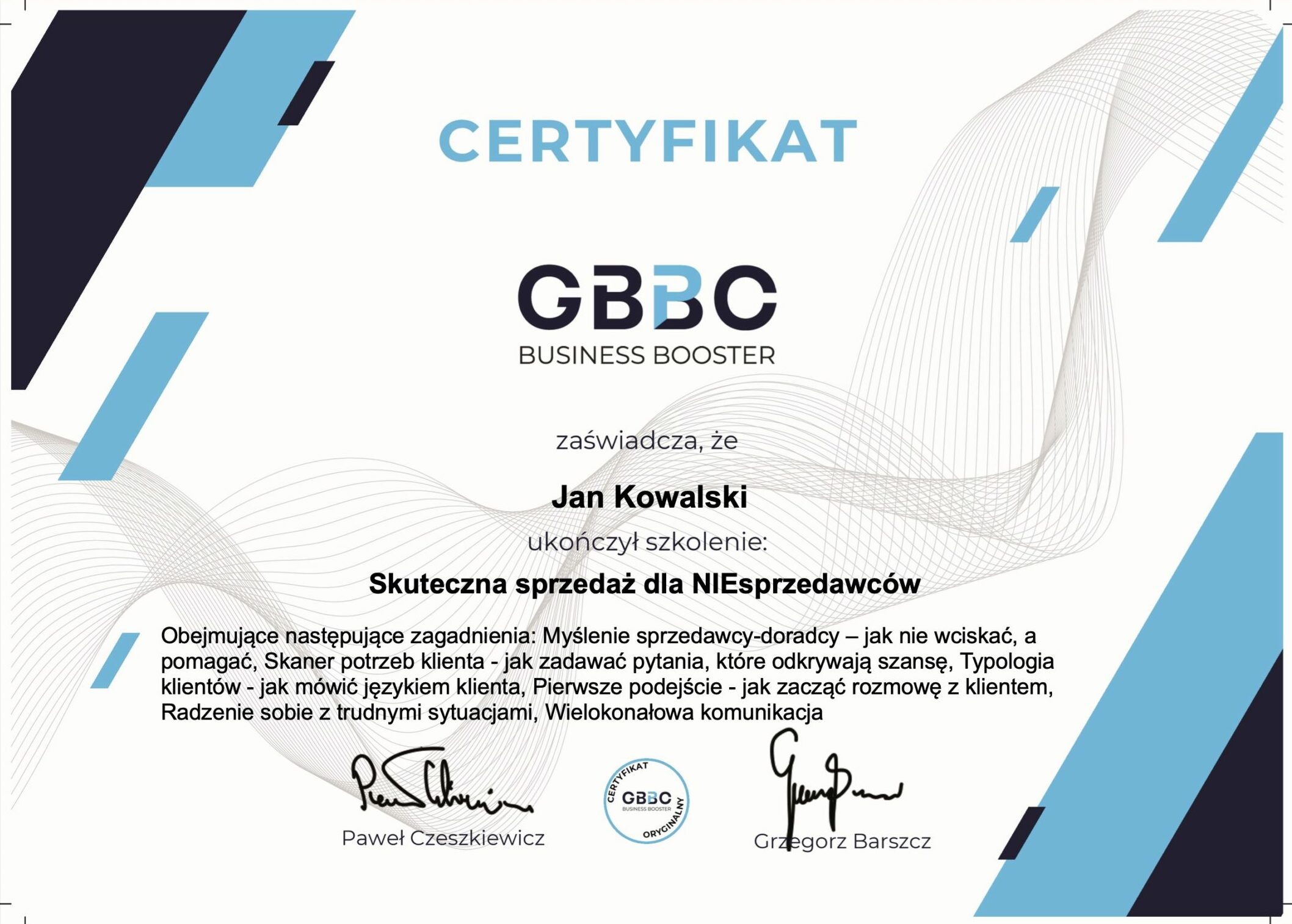 Każdy uczestnik szkolenia Skuteczna sprzedaż dla NIEsprzedawców otrzymuje imienny certyfikat, który jest oficjalnym potwierdzeniem zdobytej wiedzy i umiejętności. Dokument ten nie jest jedynie pamiątką - stanowi praktyczne narzędzie budowania wiarygodności zawodowej. Certyfikat potwierdza, że przeszedłeś przez intensywny, praktyczny program, a zdobyta wiedza i narzędzia mogą być od razu wykorzystane w codziennej pracy.
